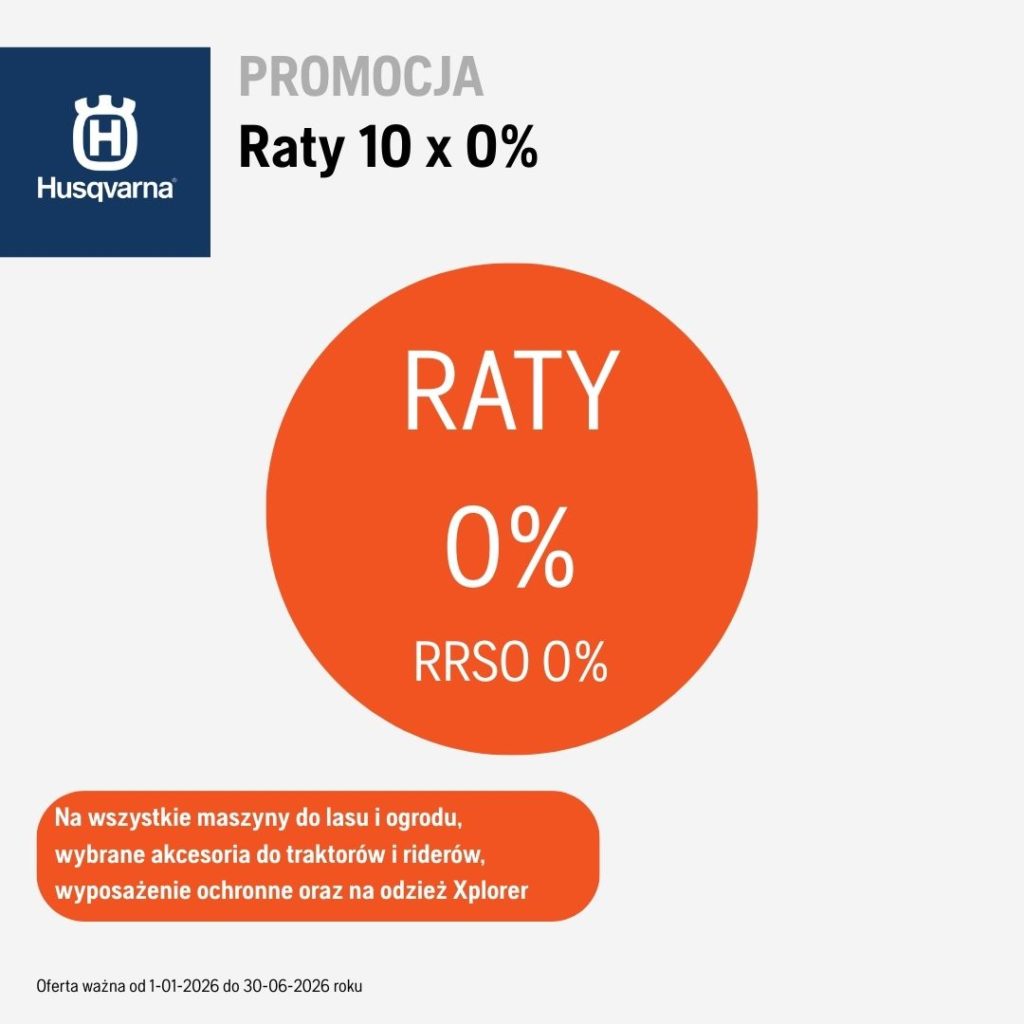 Zapraszamy do skorzystania z oferty zakupu w kredycie 10 RAT 0% na wszystkie maszyny do lasu i ogrodu Husqvarna, wybrane akcesoria do Riderów i traktorów, wyposażenie ochronne oraz serię outdoorową Xplorer. Oferta ważna do 31-12-2024 roku.